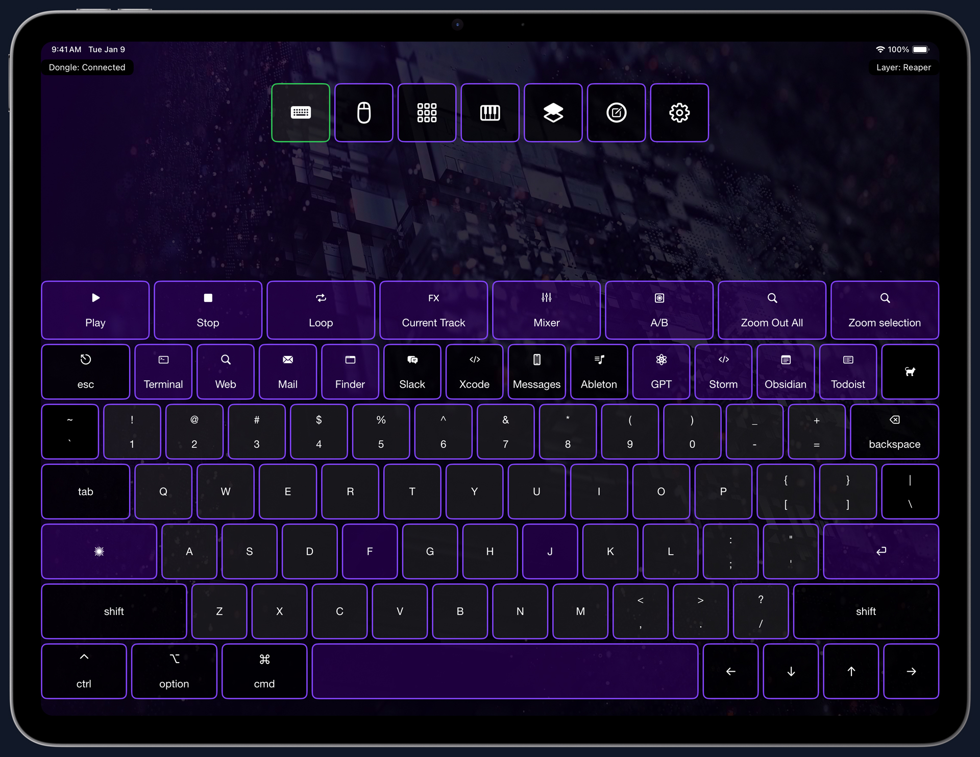 Keepad is a compact dongle that pairs with an app available for iPhone and iPad to give you a custom wireless keyboard, touchpad, macropad, and MIDI controller — all in one. Simply plug the dongle into a computer, then connect the app. That’s it!